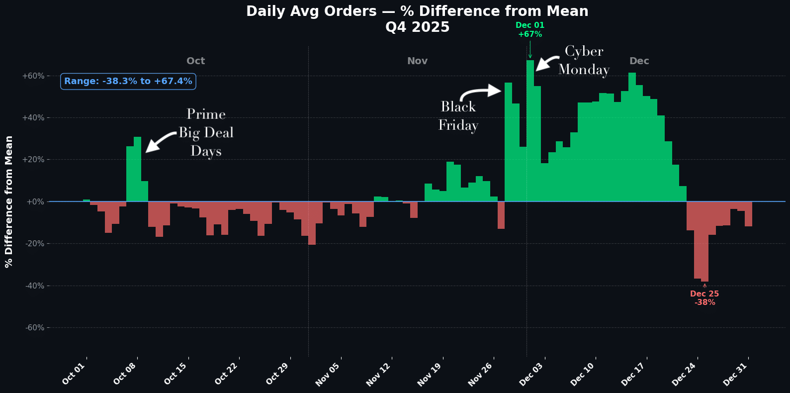 To answer those questions, Seller Snap analyzed daily order volume across 2024 and 2025, indexing each day as a percentage difference from that year’s average daily orders.