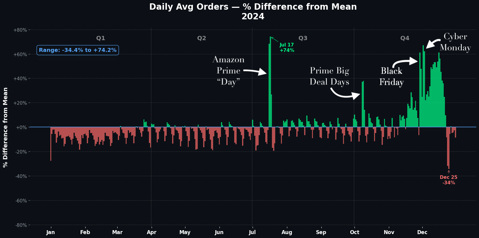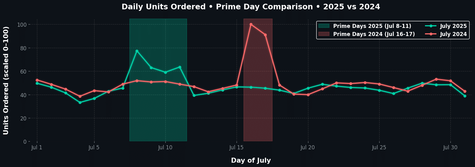 In 2024, the largest single-day spike of the entire year occurred in mid-July, reaching roughly +74% above that year’s average daily order volume. That magnitude is not incidental. It reflects a demand event large enough to stress pricing systems, inventory availability, advertising efficiency, and fulfillment operations simultaneously.